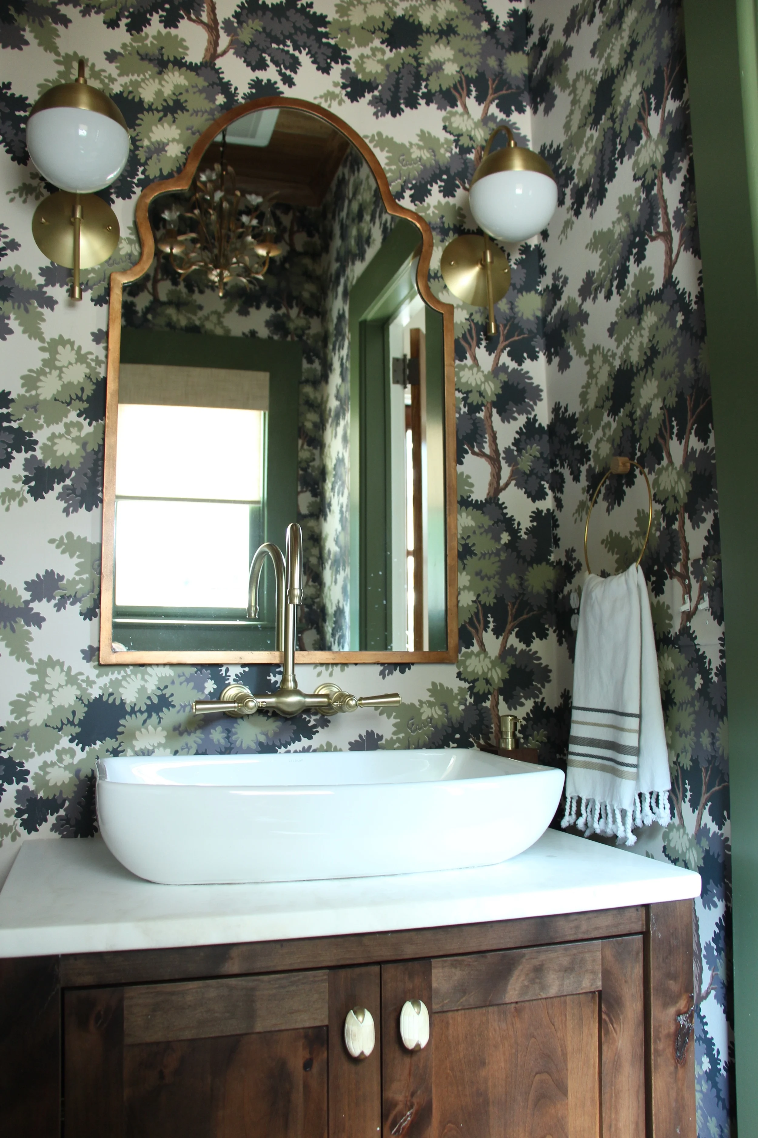 This powder bath combines warm wood, unique marble and detailed wallpaper accented by glam brass fixtures for a look all it's own.